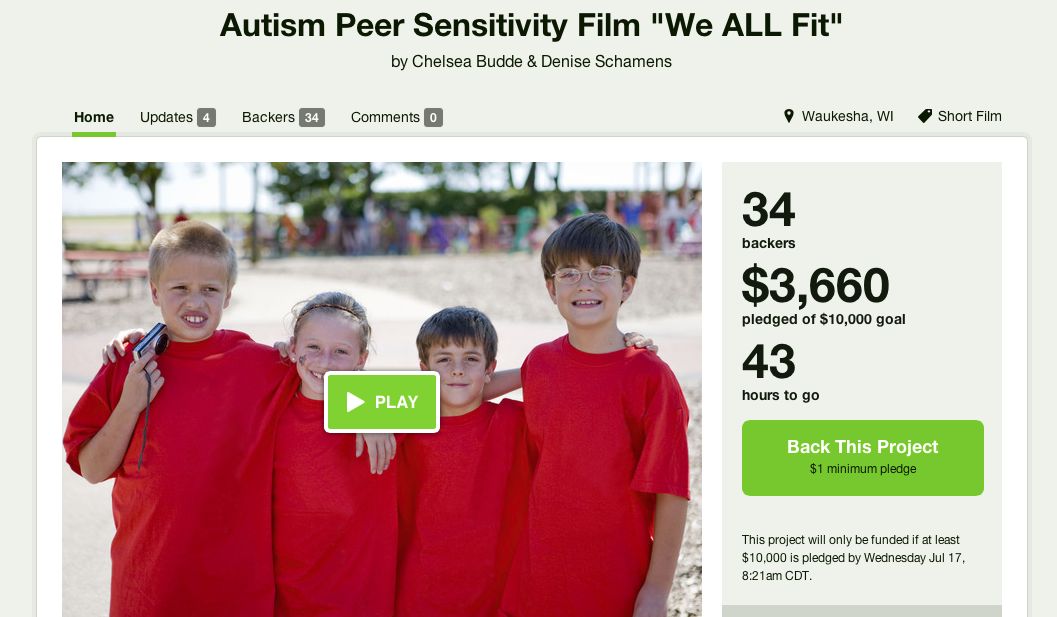 First, we successfully completed our $10,000 Kickstarter crowd-funding project for our new elementary school autism peer sensitivity film! Yahooooo!!! Special thanks to Rob Lindemann for his $500 donation. Because of Rob and other people who believe in our Awareness-Acceptance-Empathy mission, we are able to move forward with our casting call August 5 & 6. If you still want to donate to this project, we will gladly accept your donation via our website or by mail and will be happy to honor the rewards promised through the Kickstarter campaign at the $25, $100, and $1,000 levels.
